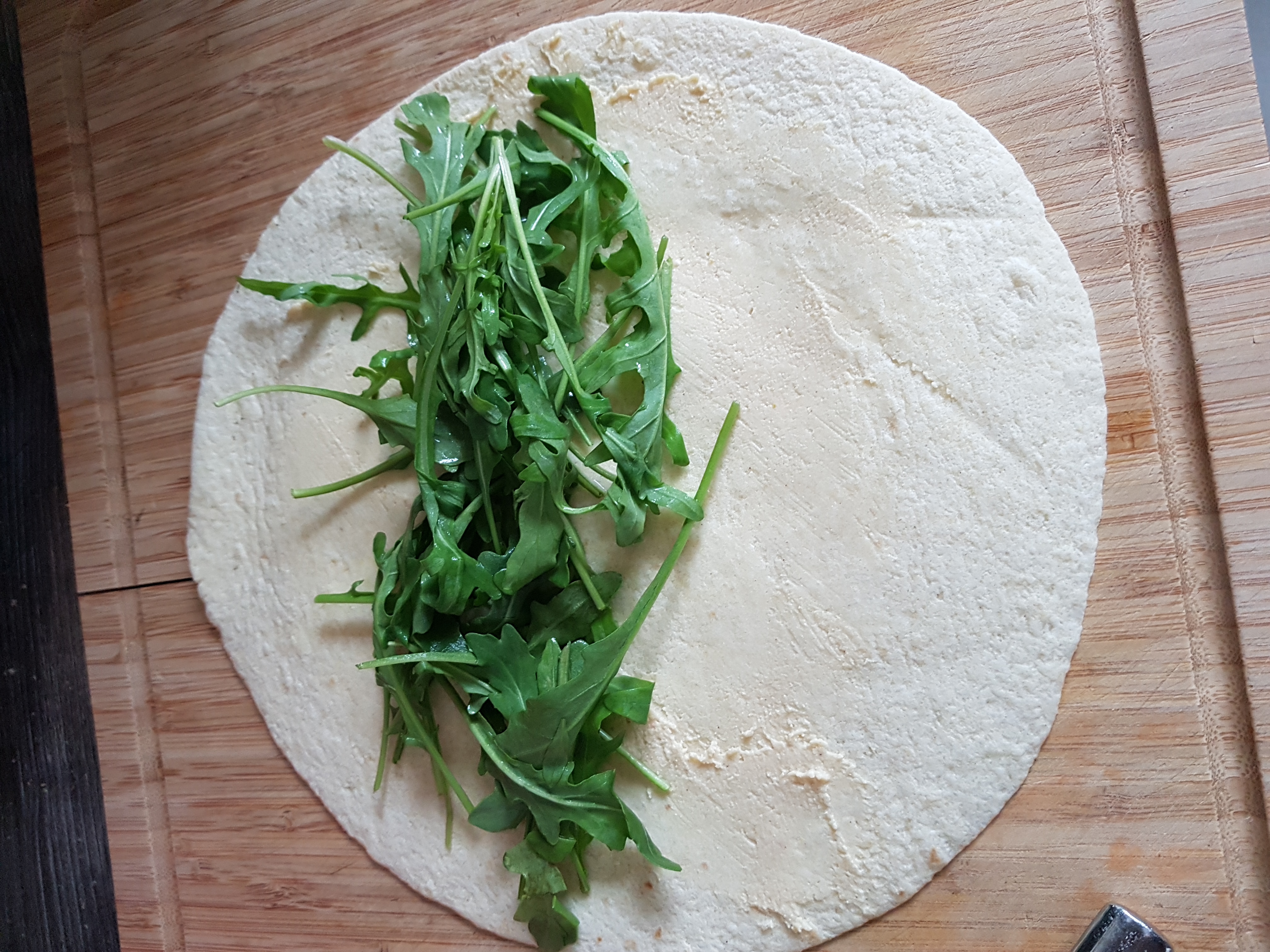 Wrap mit Humus, Rucolasalat, etwas Sojajogurt oder Frischkäse  und bei uns als Toping Harrisa Gewürz.